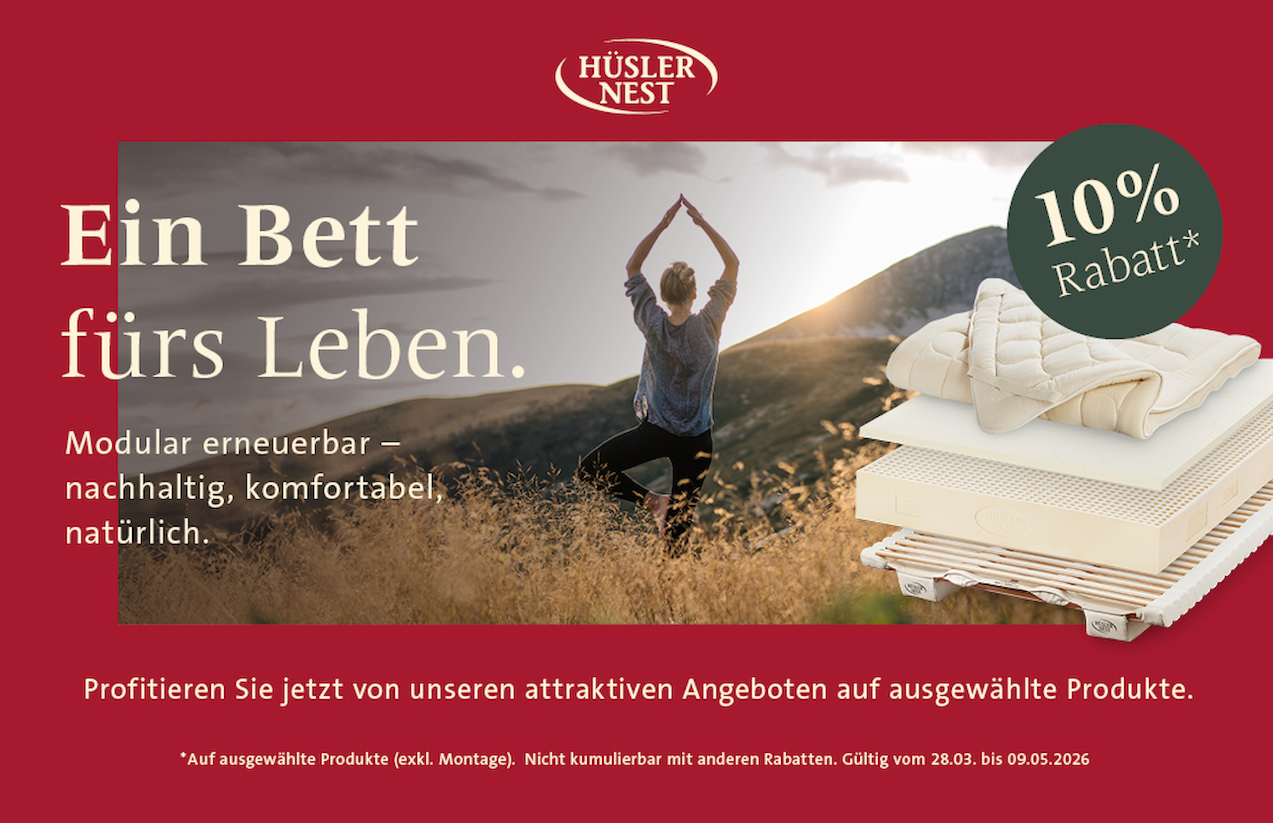 Hüsler Nest - Frühjahrsaktion 2026Natürlich schlafen. Erholt aufwachen.Profitieren Sie von 10 % Rabatt auf ausgewählte Produkte aus dem Hüsler Nest Sortiment